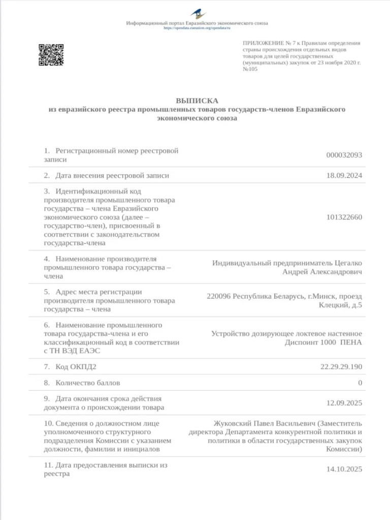 Дозатор локтевой 1шт; Крепёж настенный 3шт; Паспорт на устройство 1шт; Флакон 1000мл 1шт